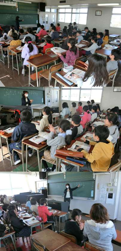 2月8日(水)、4年生の音楽授業のようすです。『こきりこ』を題材に、日本の音楽の雰囲気を感じ取って、打楽器で演奏する学習に取り組んでいました。