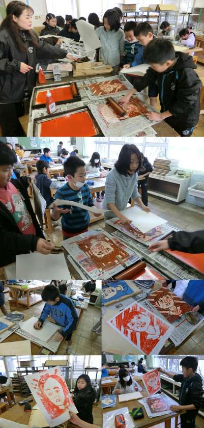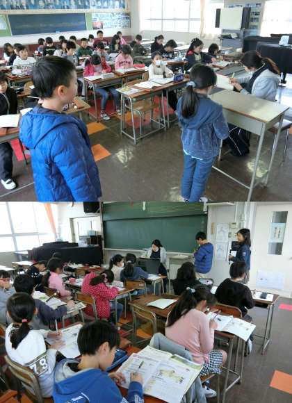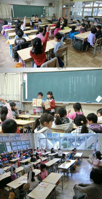 2月20日 今日の授業から 公開日 2017/02/20 更新日 2017/02/20 1年生 2月20日(月)、1年生の国語、3年生の音楽、4年生の図画工作授業のようすです。1年生は、『これはなんでしょう』の単元で、三つのヒントを出して品物の名前を当てるクイズの司会を、2人組になって取り組んでいました。3年生は、リコーダーで『エーデルワイス』を演奏するテストをしていました。4年生は、『ほってすって見つけて』の単元で、彫り上げた木版画を刷っていました。