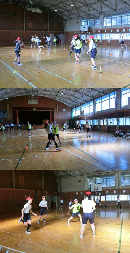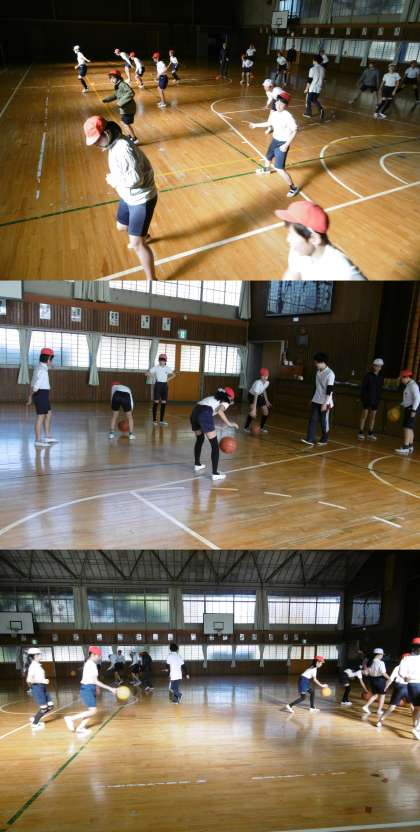 2月24日(金)、6年生の体育授業のようすです。ボール運動「ゴール型 バスケットボール」に取り組んでいました。今日は、1分間バウンドとバウンドトライアングル練習をしてから、パスゲームをしました。練習方法を工夫して、運動量を高めることができました。