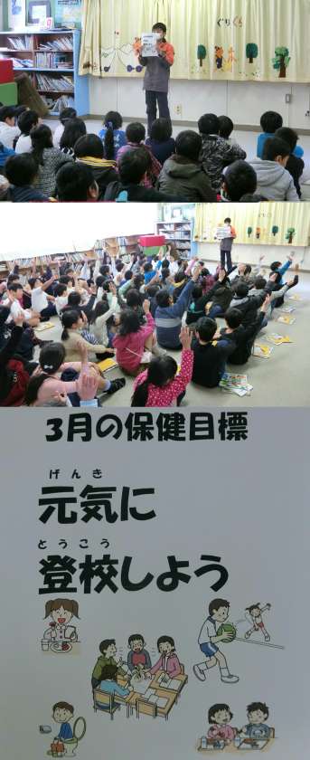 3月1日(水)、保健委員が、朝の会の時間に各学級へ「今月の保健目標」を伝えました。3年生は、学年全員で保健委員の話を聞きました。3月の保健目標は、『元気に登校しよう』です。早ね・早おきを心がけて、朝ごはんをきちんと食べてください。