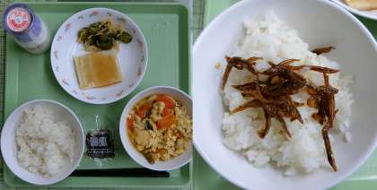 3月6日(月)、今日の給食献立は、「麦ごはん・牛乳・高野豆腐の卵とじ・はんぺんのたれかけ・切り干し大根のさっぱり漬け・『いかなごのくぎ煮』」でした。