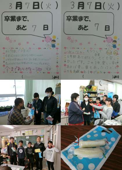 3月7日 6年生 『ラスト7日』 公開日 2017/03/07 更新日 2017/03/07 6年生 3月7日(火)、卒業まで『ラスト7日』です。お世話になった先生に、サンドイッチとカードを渡しました。6年生のみなさん、ありがとうございました。