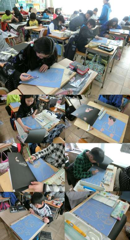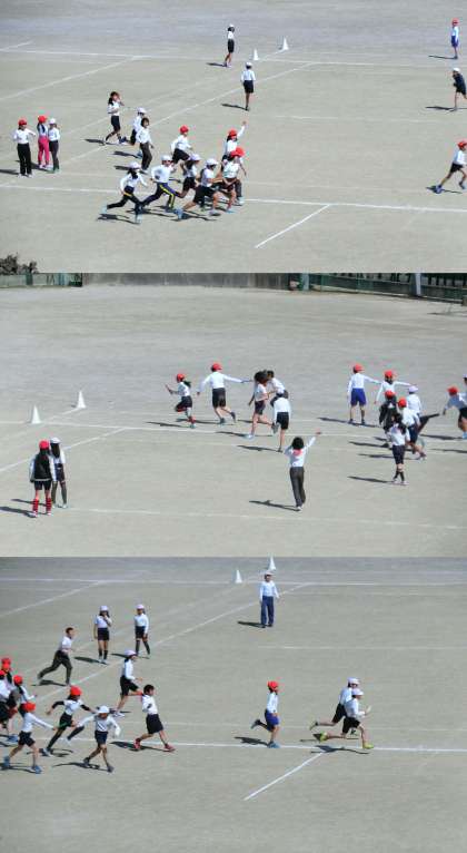 3月17日(金)、4年生の体育、5年生の図画工作授業のようすです。4年生は、運動場のトラックを使ってリレーの練習をしていました。5年生は、一版多色刷りに取り組んでいました。