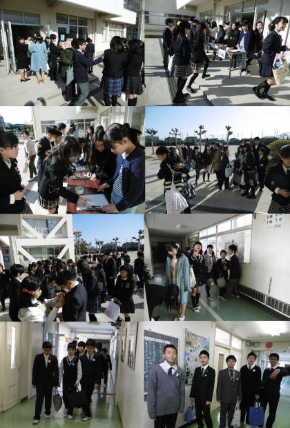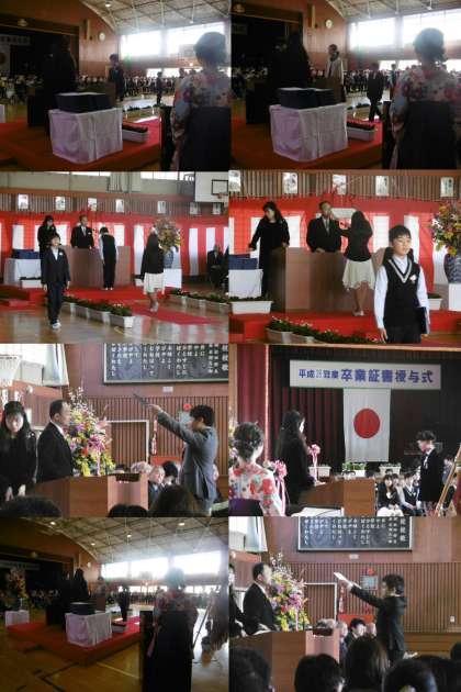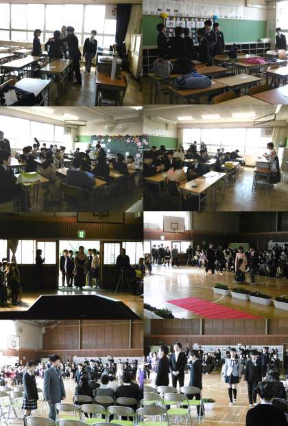 登校、受付、式前の教室、入場、卒業証書授与のようすです。