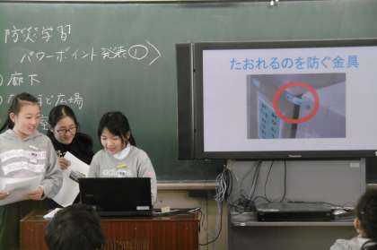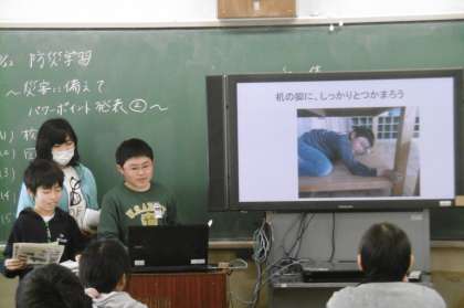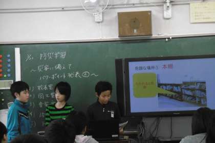 プレゼンテーションソフトを使おう! 公開日 2017/03/22 更新日 2017/03/22 5年生 5年生は、3学期の総合的な学習では防災について学習しました。3月22日(水)、学校内の危険な箇所や防災対策がしてある箇所をプレゼンテーションソフトを使って、発表をしました。この一年で、パソコンの使い方や発表の仕方が上達しました。