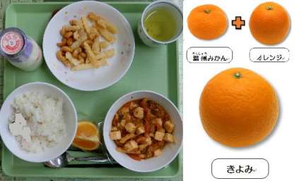 3月22日(水)、今日の給食献立は、「麦ごはん・牛乳・マーボ豆腐・フレンチポテトとナッツの揚げ物・『カットきよみ(清見)』」でした。