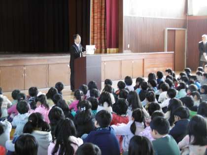 さきほど、みなさんの学年の代表に修了証を渡しました。この修了書には、「この1年間よくがんばって、それぞれの学年の勉強や生活を終了することができました」ということを証明する印です。4月には新1年生が入学して、1年生は2年生、2年生は3年生、3年生は4年生にと、1学年ずつ進級することになります。おめでとうございます。