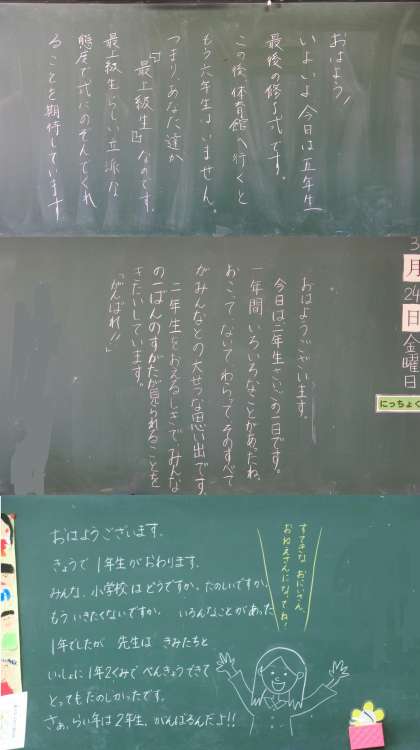 3月24日 修了式後の学級のようす 公開日 2017/03/25 更新日 2017/03/25 児童のようす 3月24日(金)、修了式後の学級のようすです。1年間の学校生活のようすが記された「あゆみ」を、担任の先生から受け取っていました。今日は、28年度の最後の日です。今のクラスで過ごすのも、今日で終わりです。いっしょに生活してきた1年間を、どのクラスも振り返っていました。