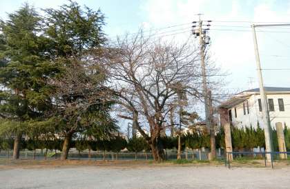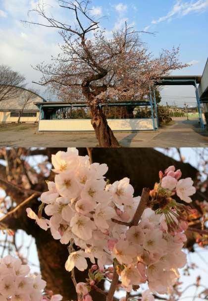 4月3日(月)、小運動場前と校庭のサクラのようすです。小運動場前のサクラは、花がたくさん開いてきました。