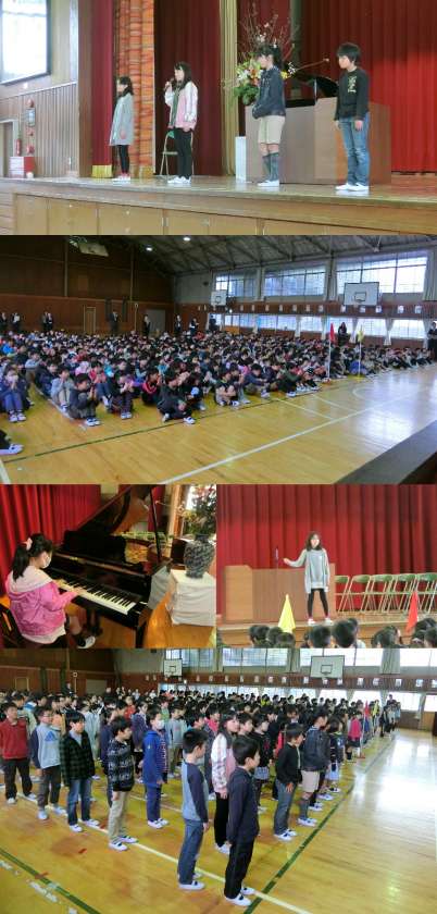 1年生と在校生との対面式を行いました。はじめに、在校生を代表して6年生児童から1年生にメッセージが送られ、その後1年生全員でお礼の言葉を在校生に言いました。これで、408名みんなが新しい仲間になりました。在校生のみなさん、1年生をよろしくお願いします。そして、始業式を行いました。校長先生のお話と担任発表の後、6年生4名が『誓いの言葉』で、「通学班の班長の役割をしっかり行う。」「ピアノの練習をがんばる。」「英検3級合格をめざす。」「サッカーのリフティング100回をめざす。」など、6年生になって取り組むことを発表しました。
