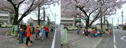 4月10日(月)、登校のようすです。今日からは、1年生や転入生もいっしょに登校しています。どの班からも、元気のよいあいさつが返ってきました。