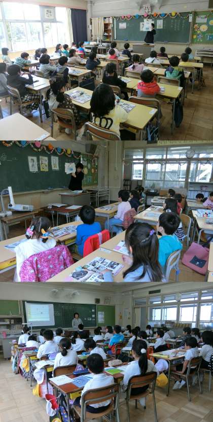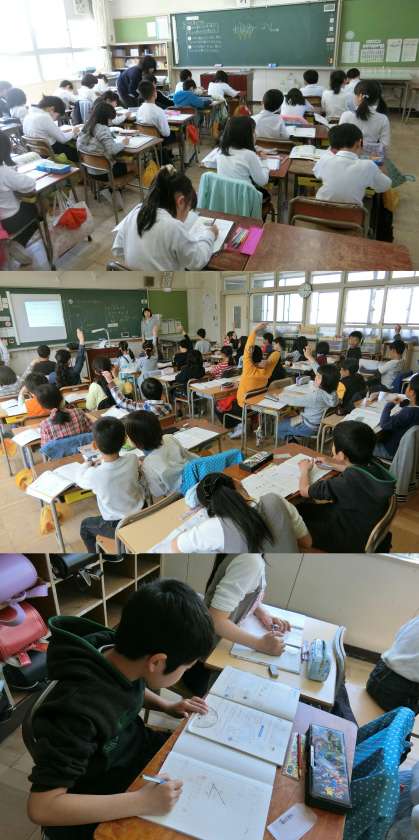 4月12日(水)、1年生の生活科、3年生と4年生の算数授業のようすです。1年生は、トイレの使い方を確かめていました。3年生はかけ算のきまり見つけ、4年生は分度器を使った角度のはかり方に取り組んでいました。