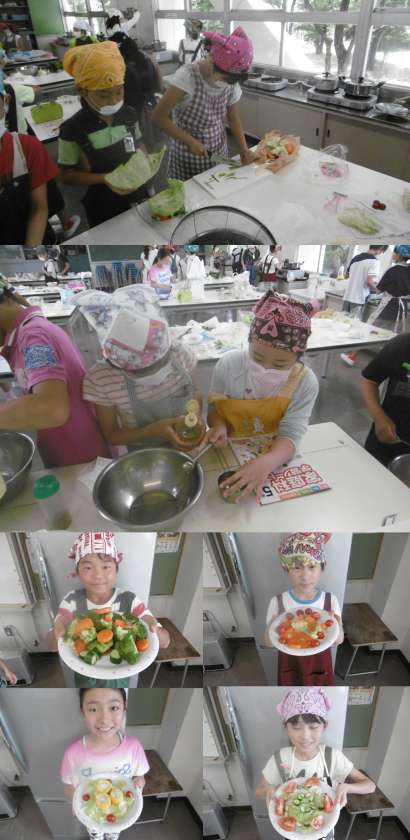 6月6日(火)、5年生の調理時で、ゆで野菜サラダを作りました。持ち寄った野菜をゆで、ドレッシングを作りました。