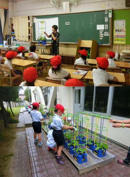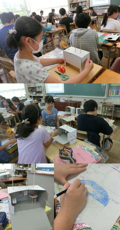 6月7日(水)、1年生の生活科、6年生の図画工作授業のようすです。1年生は、育てているアサガオに支柱を立てていました。6年生は、クランクを使った工作に取り組んでいました。
