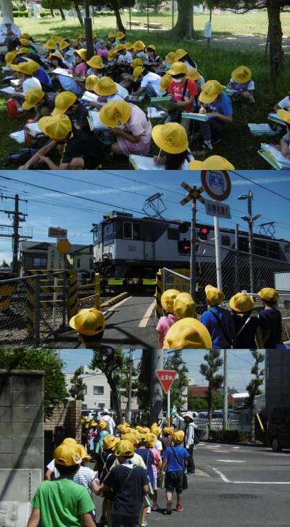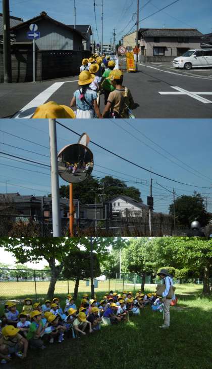 通学路にある安全のための設備や施設を見つけながら、水林公園まで歩きました。さまざまな道路標識を探したり、押しボタン式の信号を渡ったりしました。