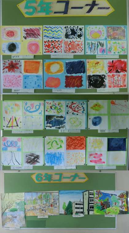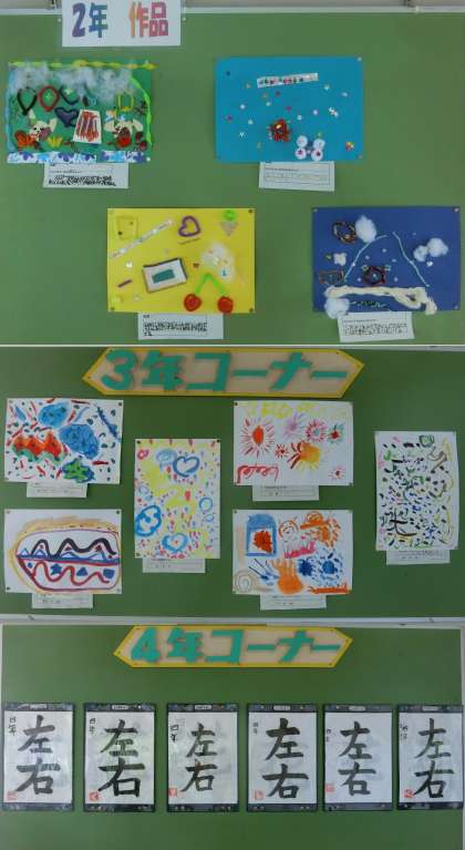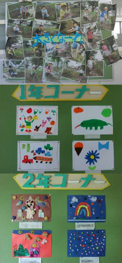 学年掲示板のようすです。図画工作と書道の作品が掲示されています。かえで・もみじ・いちょう学級は、自分たちで育てている野菜といっしょに撮った写真です。