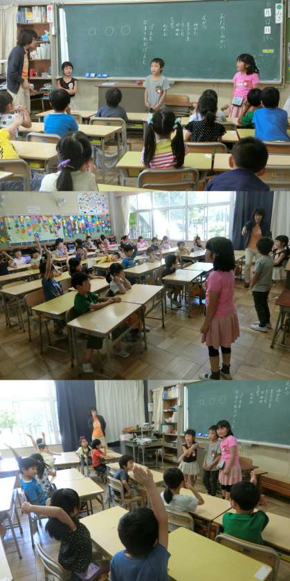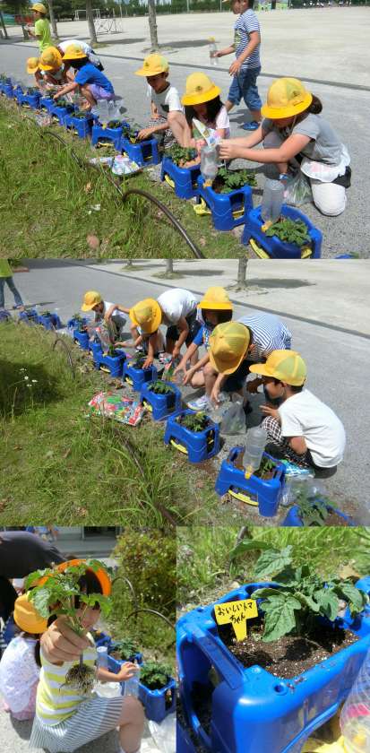 6月12日(月)、1年生の学級活動と2年生の生活科授業のようすです。1年生は、お楽しみ会で、3人が同時に一文字を言うステレオゲームをしていました。たくさん葉をつけてきたミニトマトを、1本だけ残す作業をしていました。