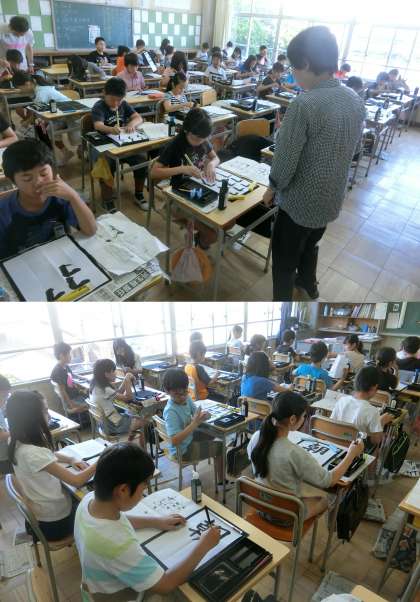 6月14日(水)、5年生の書道科授業のようすです。今日は書道講師の方に気をつけることを教えていただき、『朝日』に取り組んでいました。