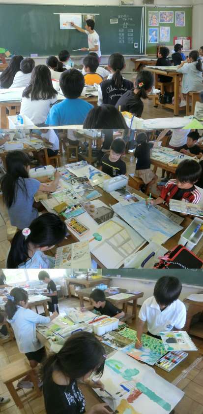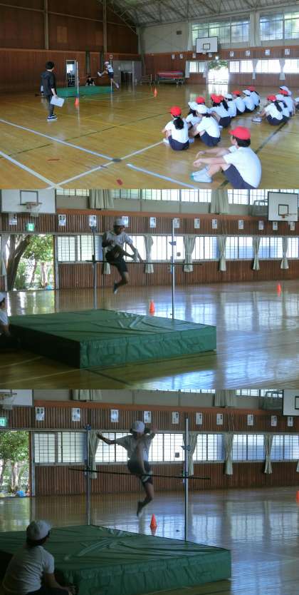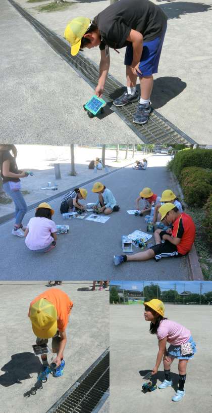 6月14日(水)、4年生の理科、5年生の図画工作、6年生の体育授業のようすです。4年生は、『電気のはたらき』の単元で、光電池を使ってモーターで動くおもちゃを走らせていました。5年生は、『じっと見つめてみると』の単元で、花を入れて描いた場所の絵に着色していました。6年生は、体育館で走り高跳びに取り組んでいました。