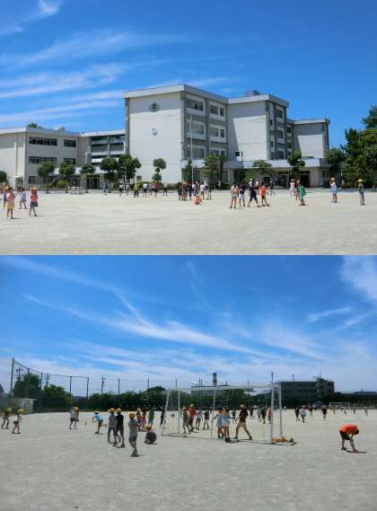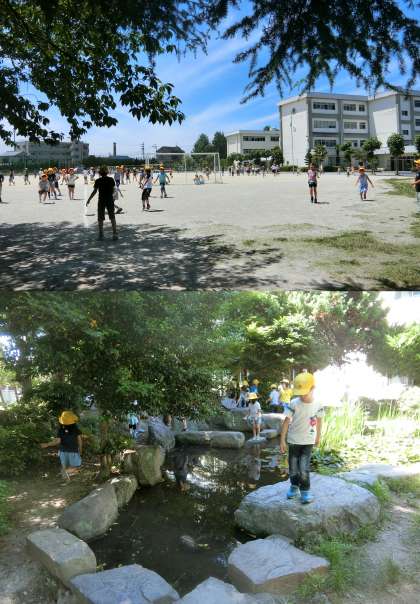 6月14日(水)、放課の運動場と観察池のようすです。運動場では、たくさんの子どもたちが元気よく遊んでいます。観察池の周りも、とてもにぎやかでした。