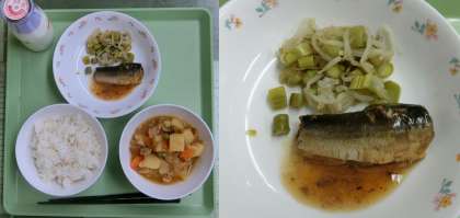 6月15日(木)、今日の給食献立は、「麦ごはん・牛乳・肉じゃが・いわしの梅煮・『もやしとアスパラの和え物』」でした。