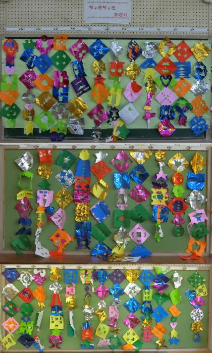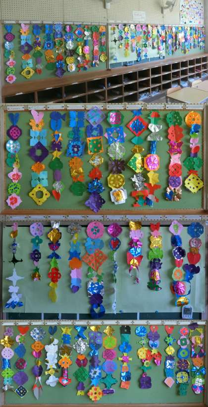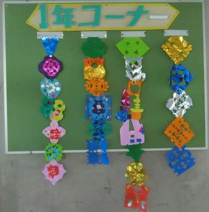 1年生の学級掲示のようすです。1年生は、図画工作で『ちょきちょきかざり』を折り紙を使って作りました。