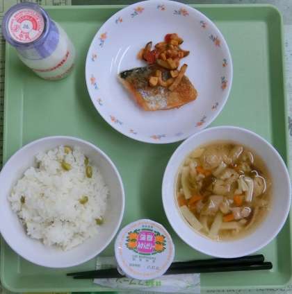6月19日(月)、今日の給食献立は、「枝豆ごはん・牛乳・五目サボテンきしめん汁・魚の夏野菜甘酢あんかけ・愛知のみかんゼリー」でした。