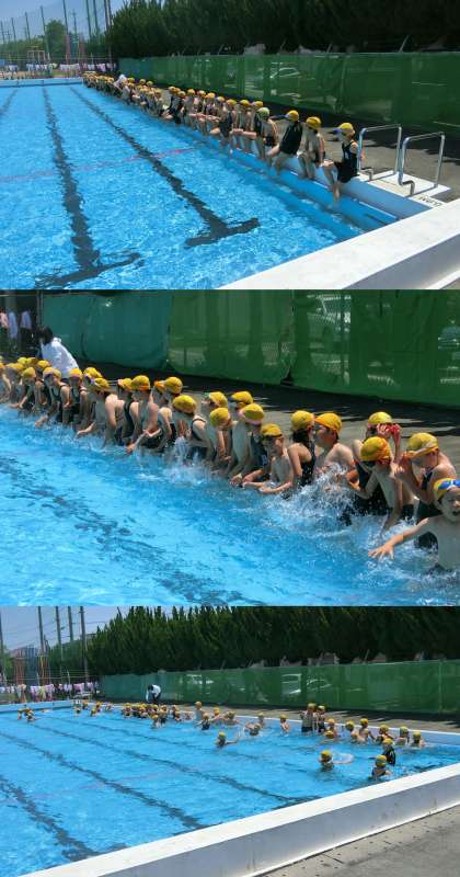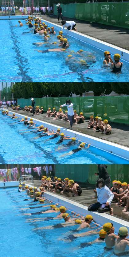 6月19日(月)、3年生の水泳指導のようすです。今日は、名古屋地方気象台の最高気温が34度をこえる暑い一日で、とても気持ちよさそうでした。