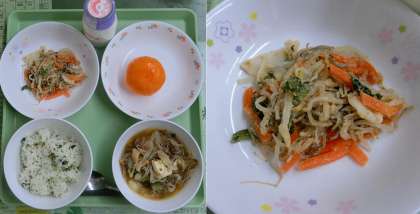 6月21日(水)、今日の給食献立は、「わかめごはん・牛乳・牛肉とたまねぎのうま煮・『おひたし』・冷凍みかん」でした。