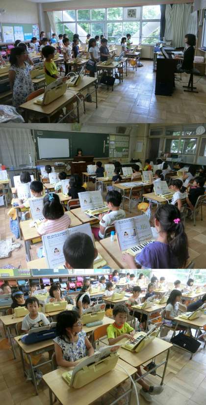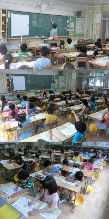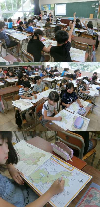 6月22日(木)、1年生の書写、2年生の音楽、3年生の社会科授業のようすです。1年生は、「にている ひらがな」に取り組んでいました。2年生は、歌と鍵盤ハーモニカに取り組んでいました。3年生は、春日井市内の道路と鉄道のようすを白地図に下記ながら確かめていました。