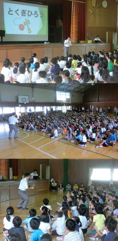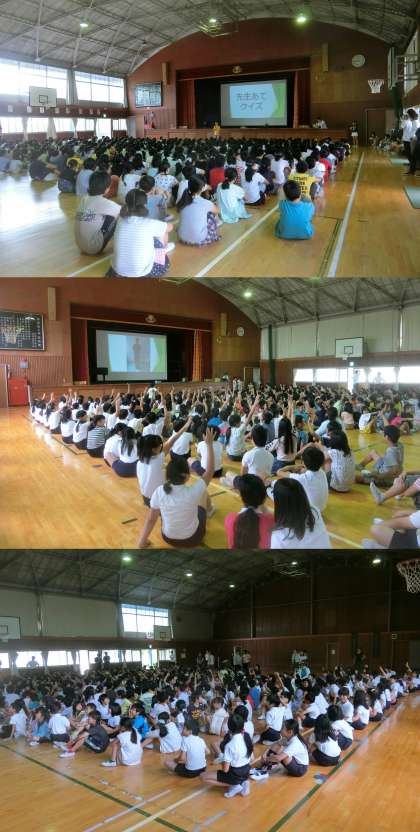 6月22日(木)、今年初めての児童集会を行いました。今日は、先生当てクイズでした。誕生日や好きな食べものや得意なことなど4つのヒントから7名の先生を考え、大変盛り上がりました。最後に、クイズで紹介された先生が、けん玉の技に挑戦しました。