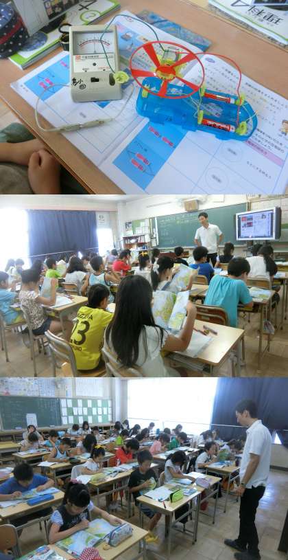 1年生は、サッカー型ゲームとうんていに取り組んでいました。4年生の国語は、図書館で見つけた本を紹介するカードを作っていました。理科は、『電気のはたらき』の単元で、電池を並列と直列にすることで、流れる電流の量やモーターが回る速さがどのように変化するか確かめていました。5年生は、寒い土地のくらしについて学習していました。