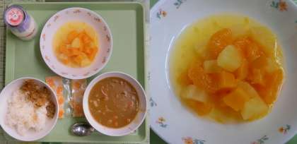 6月26日(月)、今日の給食献立は、「発芽玄米ごはん・牛乳・カレーシチュー・『フルーツミックス』・福神漬け・アーモンド入り小魚」でした。
