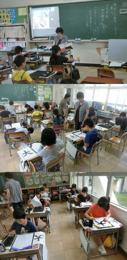 6月27日(火)、3年生の書道科授業のようすです。今日は書道講師の方に「はらい」で気をつけることを教えていただき、『大』に取り組んでいました。