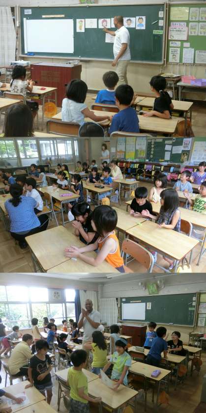6月27日(火)、2年生と5年生の外国語活動のようすです。2年生は、気持ちやからだのようすを表す「hungry」「angry」「happy」「sleepy」「fine」「sad」を、身体表現を取り入れたゲームをしながらおぼえていました。5年生は、数を聞いて答えたり、好きなものを聞いたりするゲームに取り組んでいました。
