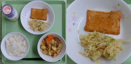 6月28日(水)、今日の給食献立は、「麦ごはん・牛乳・いりどり・さつまあげのしょうがじょうゆかけ・キャベツと切干大根のあえもの」でした。