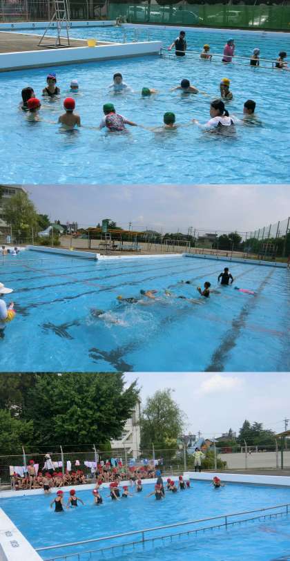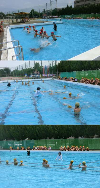 7月3日(月)、1・3年生とかえで・もみじ・いちょう学級の体育授業のようすです。1年生とかえで・もみじ・いちょう学級は、沈んだり潜ったりしながら水に慣れることに取り組んでいました。3年生は、クロールのバタ足の練習をしていました。今日の名古屋地方気象台の最高気温は34.7度で、プールの中はとても気持ちよさそうでした。