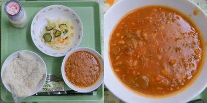 7月4日(火)、今日の給食献立は、「ソフトめん・牛乳・『ミートソース』・シャキシャキポテトサラダ・小袋たまごなしマヨネーズ」でした。