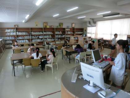放課の図書館のようすです。来週から夏休み用の図書の貸し出しを行うため、今週7日(金)までに借りている本を返します。
