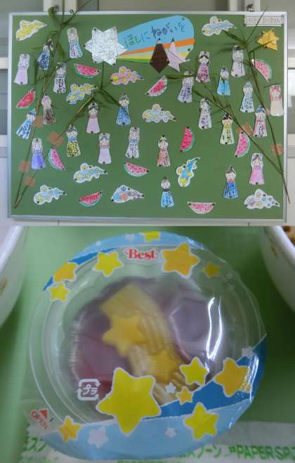 また、「そうめん」を食べる習慣もあります。そうめんは、小麦粉(こむぎこ)から作られます。小麦が無事に収穫できることへのお礼と、そうめんを天の川や、おり姫がつむぐ糸に見立てて食べます。今日の給食には、七夕をイメージしたゼリーが出ました。「ひこ星」と「おり姫」の願いと、みなさんの願いがかないますように。