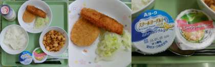 7月11日(火)、今日の給食献立は、「ごはん・牛乳・マーボ豆腐・たこ入り海鮮メンチまたはさけの米粉フライ・ボイルキャベツ・シークヮーサーゼリーまたはフローズンヨーグルト・卓上ソース」でした。
