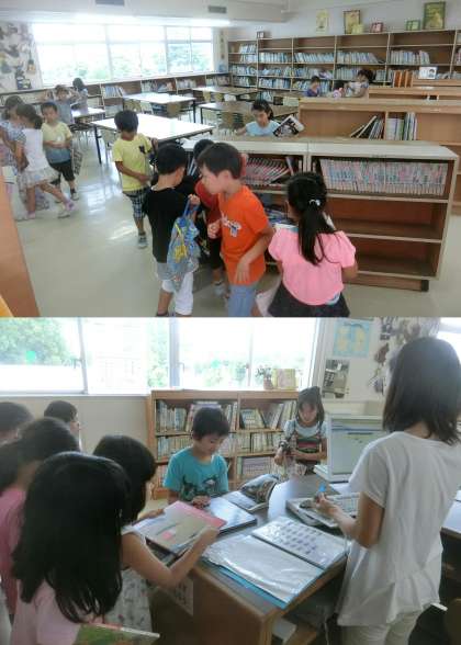 7月12日(水)、夏休みに読む図書の貸し出しが始まりました。今日は、1年生と2年生が図書館で本を借りました。