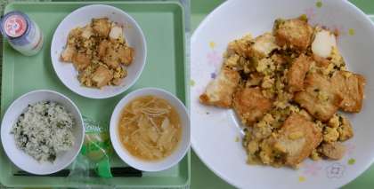 7月12日(水)、今日の給食献立は、「わかめごはん・牛乳・吉野汁・『ゴーヤチャンプルー』・冷凍洋なし」でした。