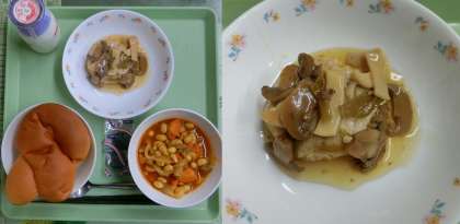 7月13日(木)、今日の給食献立は、「クロスロールパン・牛乳・大豆のインド煮・ハンバーグのサボテン入りきのこソースかけ・プルーン」でした。