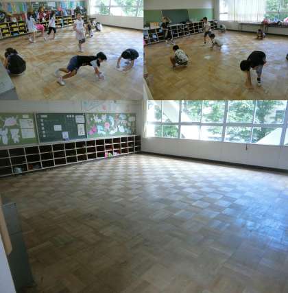 7月14日(金)、教室のワックスがけをしました。机を廊下に移動して、教室の床をしっかりと水拭きをしてからワックスをかけました。