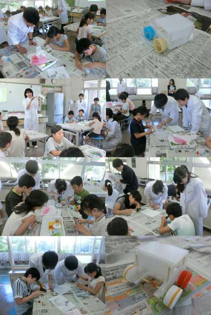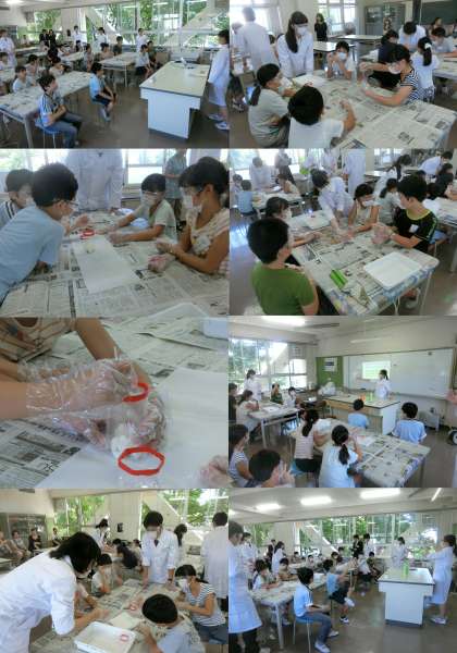 今回も中部大学の学生さんたちといっしょに、ゴムの不思議をさぐる楽しい実験をしました。ラテックスに酢酸(お酢)を混ぜて天然ゴムを作り、どうのようにして弾力性のあるゴムなっていくかを聞きました。そして、輪ゴムを使った動くおもちゃを作りました。