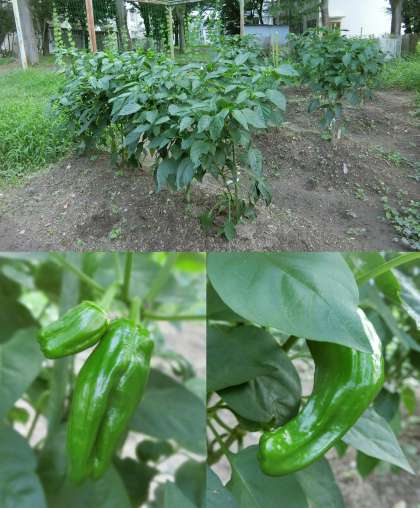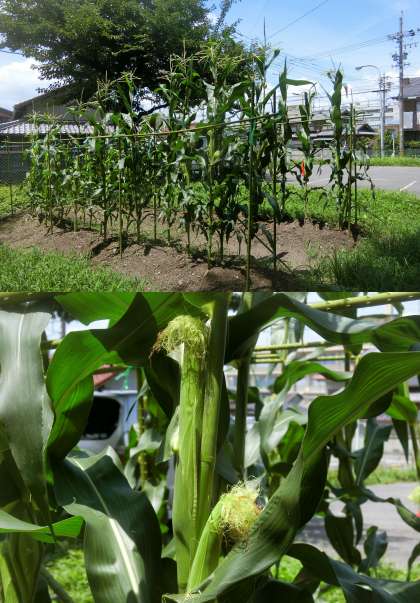 7月16日(日)、かえで・もみじ・いちょう学級が育てているトウモロコシのようすです。5月17日にみんなで植えた苗が大きく成長して、しっかりと実を付けています。となりの畑のピーマンも、大きくなっています。
