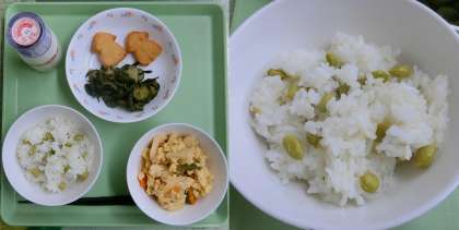 7月18日(火)、今日の給食献立は、「『枝豆ごはん』・牛乳・卵とじ・いかナゲット・きゅうりとひじきのあえもの」でした。