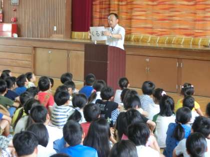 今日は、担任の先生から「あゆみ」をいただきます。みなさんが、この1学期にどれだけ「目標に向かって努力できたか」が書かれています。お家の人と一緒に、「あゆみ」を見ながら、いろいろなことを振り返ってください。しっかり振り返ると、これからやるべきことがわかってくると思います。そんなことがわかったら、明日の夏休みの最初の日からがんばることです。