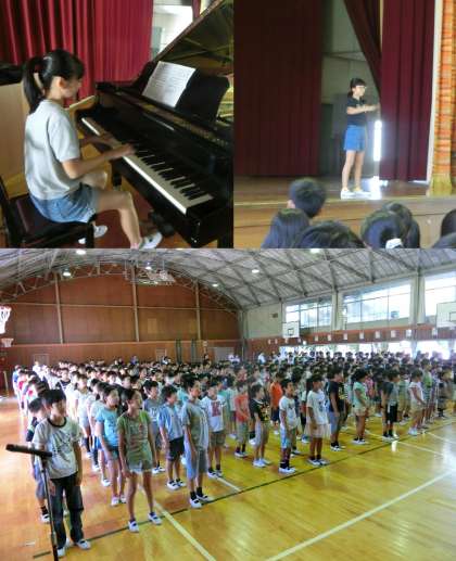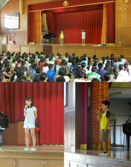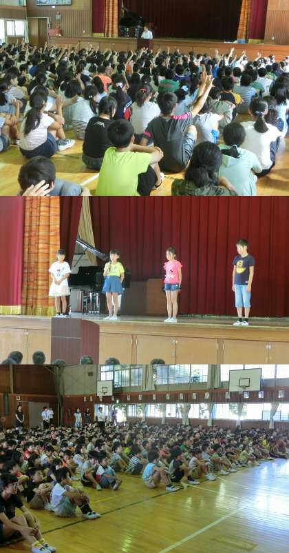 始業式では、校長先生の話を聞いた後、4年生の代表の人から、2学期の目標を発表する『誓いのことば』をしてもらいました。放課に外で元気よく遊ぶ、紅白対抗リレーで1位になる、図工の作品作りをがんばる、委員会の仕事に一生懸命取り組む、学級委員としてクラスをまとめるなどが発表されました。
